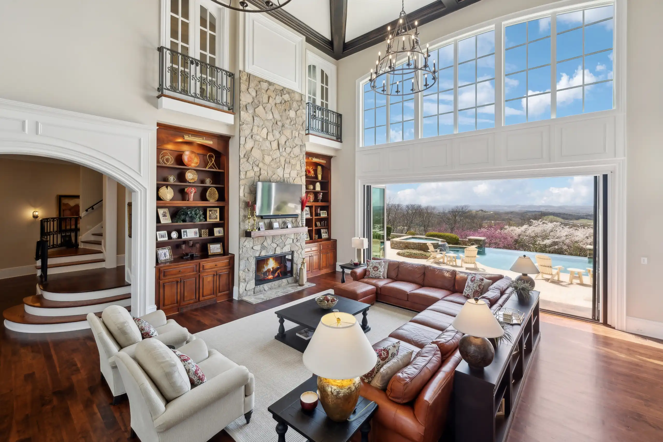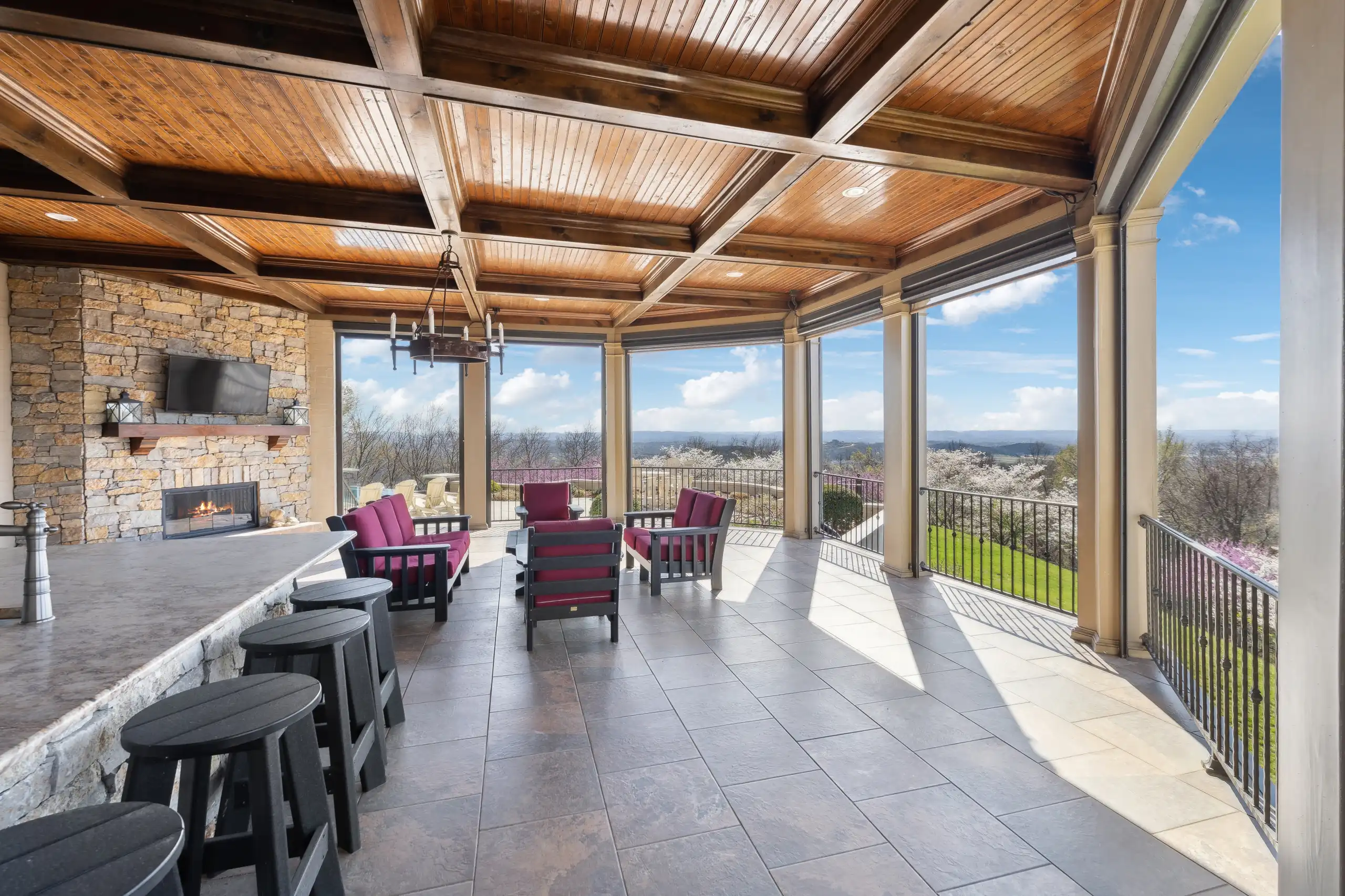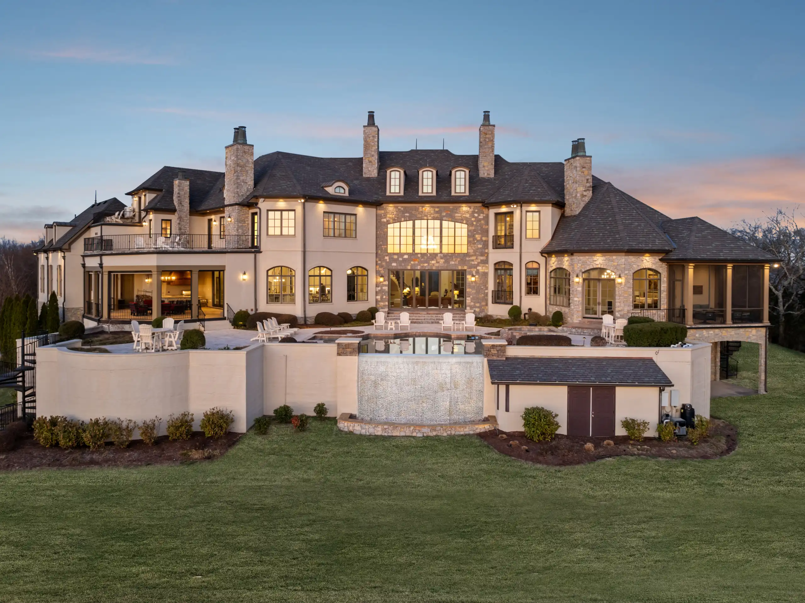 The estate offers breathtaking panoramic views, providing a stunning backdrop for mesmerizing sunsets that paint the sky in vibrant hues. The grandeur extends to an 8-car garage, complete with a lift and water hookups. Indulge in the plethora of lavish amenities, including a finished basement, a cigar room with a humidor, a wine cellar, a rejuvenating sauna, and a fully equipped gym with a locker room. An elegant elevator provides seamless access across all levels, ensuring convenience and accessibility throughout. The expansive theater room and sophisticated outdoor kitchen set the stage for unparalleled entertaining, while the shimmering infinity pool and spa provide a tranquil oasis. Inside, the estate is a testament to exquisite craftsmanship, featuring multiple porches, 5 stunning fireplaces, and a state-of-the-art kitchen adorned with Sub-Zero appliances. The ambiance is further elevated by the sophisticated Control4 lighting system, ensuring every moment is perfectly lit.