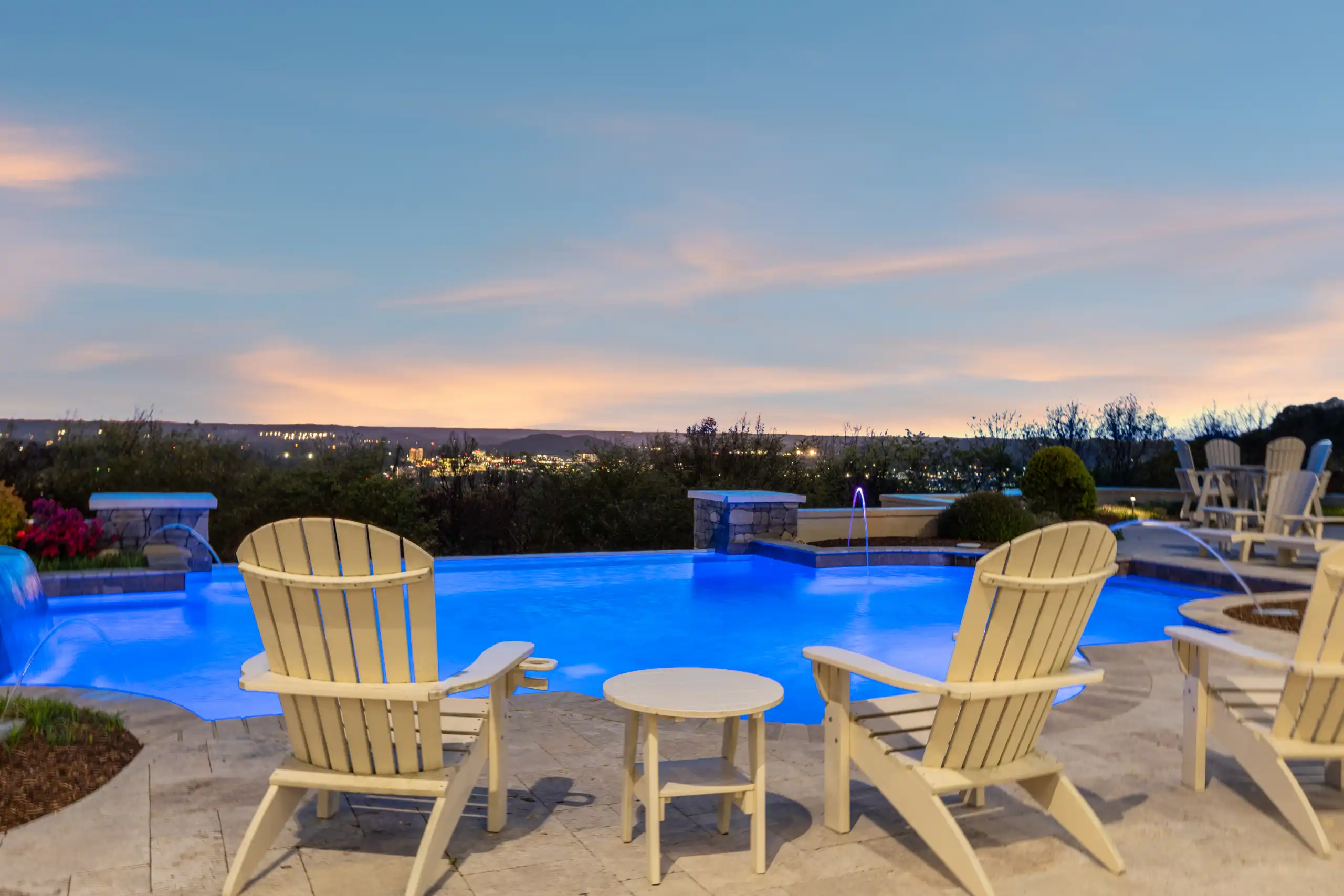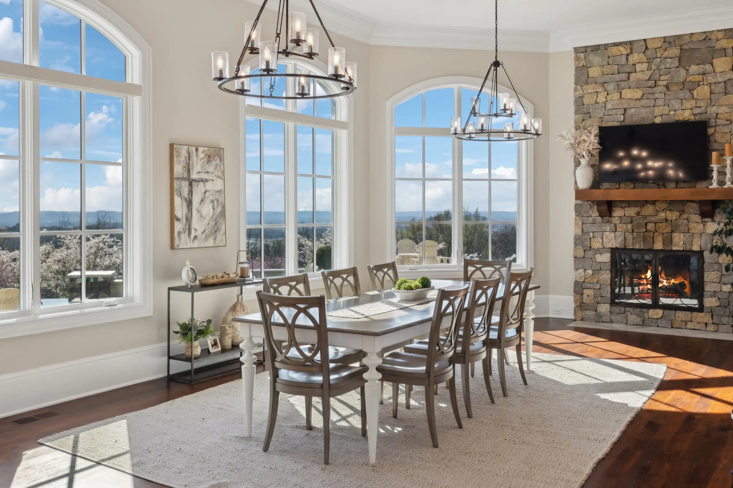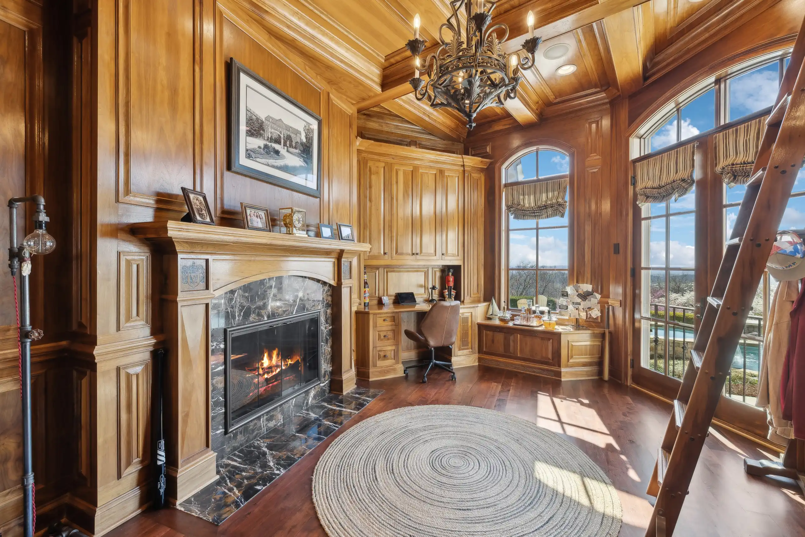 The estate offers breathtaking panoramic views, providing a stunning backdrop for mesmerizing sunsets that paint the sky in vibrant hues. The grandeur extends to an 8-car garage, complete with a lift and water hookups. Indulge in the plethora of lavish amenities, including a finished basement, a cigar room with a humidor, a wine cellar, a rejuvenating sauna, and a fully equipped gym with a locker room. An elegant elevator provides seamless access across all levels, ensuring convenience and accessibility throughout. The expansive theater room and sophisticated outdoor kitchen set the stage for unparalleled entertaining, while the shimmering infinity pool and spa provide a tranquil oasis. Inside, the estate is a testament to exquisite craftsmanship, featuring multiple porches, 5 stunning fireplaces, and a state-of-the-art kitchen adorned with Sub-Zero appliances. The ambiance is further elevated by the sophisticated Control4 lighting system, ensuring every moment is perfectly lit.