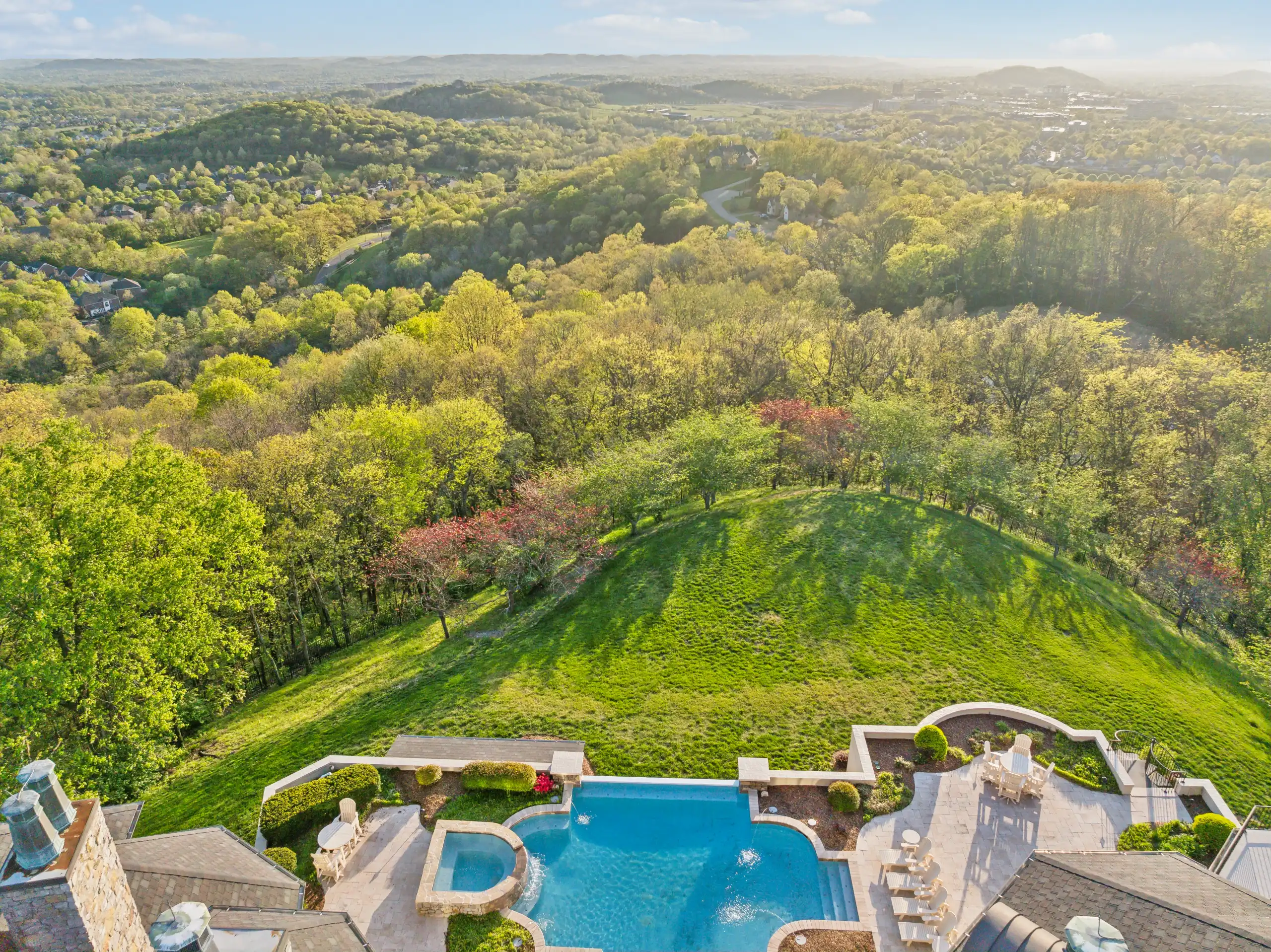 Welcome to a realm of unparalleled luxury and sophistication, where every detail of this magnificent estate has been meticulously crafted to offer an extraordinary living experience. Nestled atop a serene hilltop within an exclusive gated community, this architectural masterpiece presents 7 opulent bedrooms, 8 full baths, and 2 elegant half baths, all enveloped within nearly 15,000 sq. ft. of refined elegance. Set on 5.05 acres of pristine landscape, the property greets you with a grand gated entrance, a sweeping circular driveway, and a stately porte-cochère, leading to a majestic entrance adorned with gas lanterns.